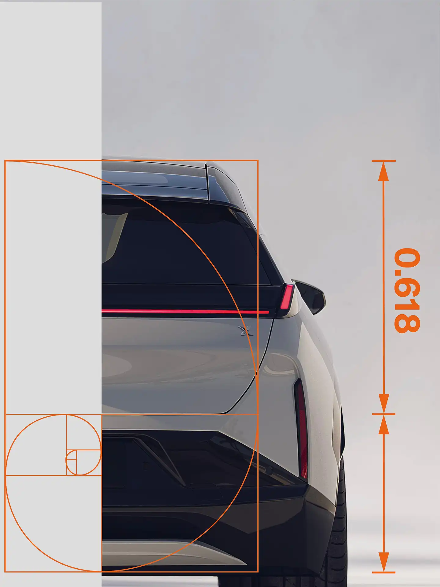 Автокөлік дизайнындағы сұлулық — бұл «ұстамды өнер» формасы, мұнда пропорцияның дәлдігі көлем мен үйлесімділікті сезіндіреді. Zeekr X басынан бастап дәстүрлі автомобиль пішіндерінен асып түсу мақсатында жасалғанымен, оның алтын қима түріндегі эстетикалық өзегі сақталған. Бұл модельде алдыңғы тордың биіктігі мен көліктің жалпы биіктігі, жанар айна мен бүйір профильдің, сондай-ақ артқы есік пен көлік биіктігінің қатынасы 0,618 коэффициентімен белгіленген. Осындай пропорциялық дәлдік көліктің барлық бұрыштан көркем және үйлесімді қабылдануын қамтамасыз етеді.
