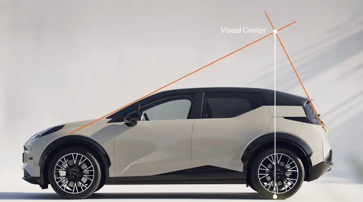 Автокөлік дизайнында «визуалды орталық» ұғымы бар. Ол неғұрлым алға жылжыған сайын — көлік соғұрлым серпінді көрінеді; ал артқа қарай ығысқан сайын — тұрақтылық әсері күшейеді. Zeekr X моделін жасау барысында команда эстетикалық пропорцияларды мұқият сақтап, осы екі қасиеттің үйлесіміне қол жеткізді. Визуалды орталықтың көліктің артқы жағына жақын орналасуы — тұрақтылық пен сенімділік сезімін күшейтіп, автомобильге нық және салмақты сипат береді.